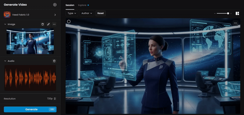 Process: The character image was uploaded into Veed Fabric 1.0, paired with the synthetic voice track, and rendered in 720p resolution.